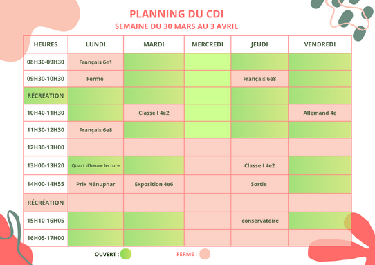 CDI - Planning de la semaine du 30 mars au 3 avril